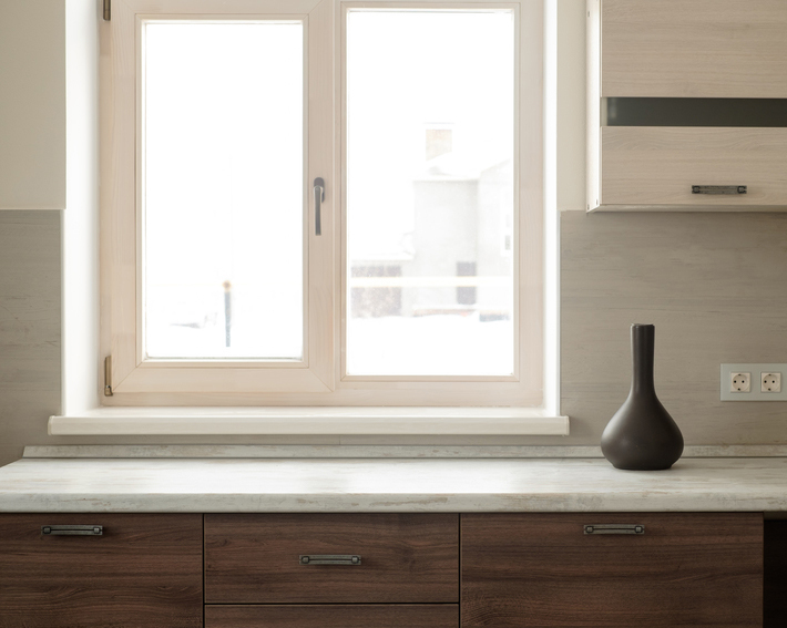 Окно на кухню — красиво и функционально. Дополнительная рабочая поверхность, матовый подоконник, защита от запотевания, простая и быстрая уборка. Примерьте к своей кухне!